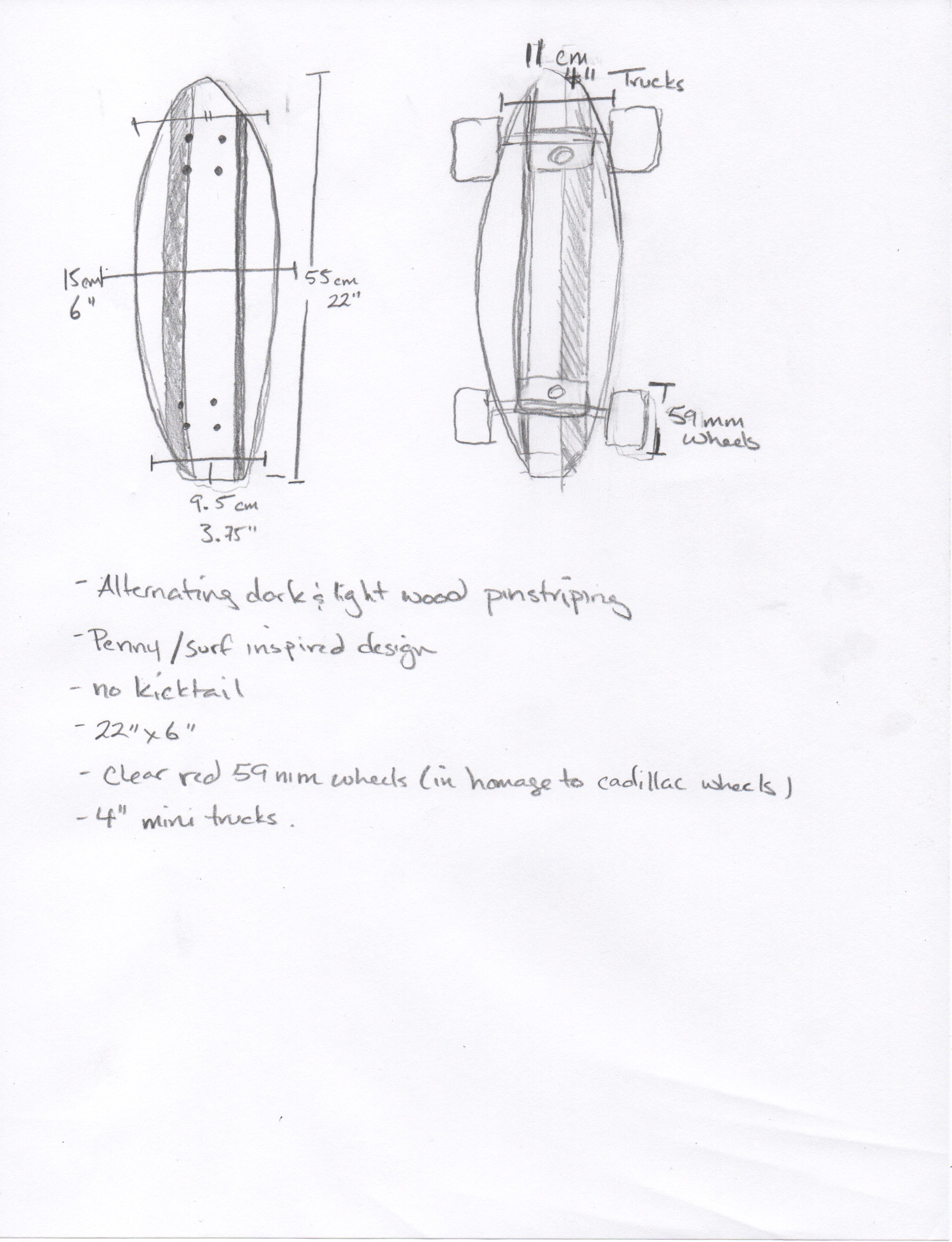 Here are my design drawings for this project. I plan to a subtle pinstripe in a darker hardwood. Since a hardwood deck is relatively heavy I thought I’d build it on the smaller cruiser design. There is no kicktail because I’m not ready/don’t know how to bend hardwood. I am currently looking at ordering 4″ penny trucks and wheels off the internet to complete the build when it arrives.