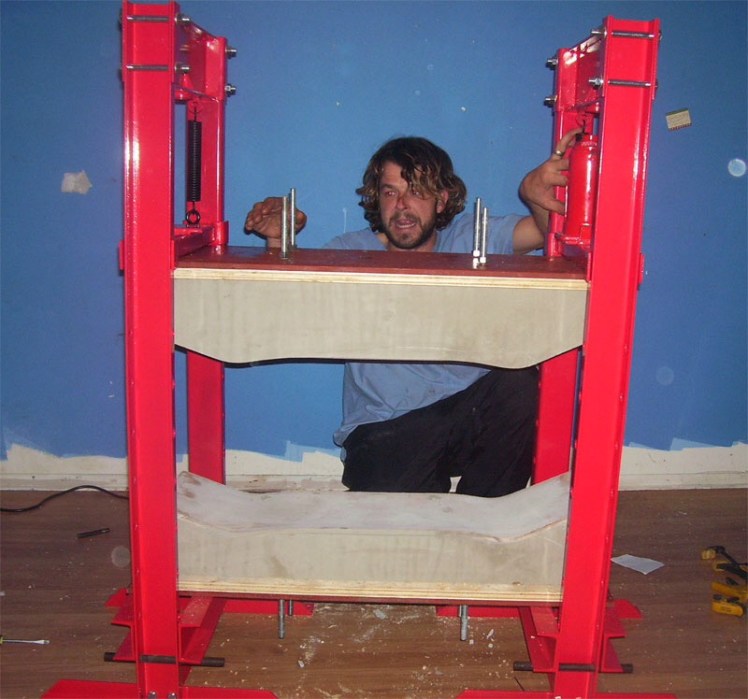 The first step was to find ways to build a custom formed skateboard deck. The hardwood cruiser is great for practicing concepts like design, cutting the shape from wood, and placing the trucks, hardware etc. The hardwood cruiser however does not lend itself well to manipulation. Bending hardwood is possible but fairly difficult. It requires steam bending. This is doable at home but fairly labour and time intensive. The next concept for skateboard building and shaping is laminating or pressing multiple thin veneers. Curving the layers of veneer is much easier and really just involves a couple steps including some pre-planning and some patience. The first technique I came across for pressing skateboards on your own is a hydraulic press. Also know as a “hillbilly press”. Is involves pouring concrete forms/carving wooden forms that you press the layers of veneer between. The weight of the concrete plus pressure from clamping/pressing the forms together shapes the veneer as the layers are glued together. This press is effective once built but takes some time to build and changing the shape of the board means you need to pour new concrete forms.