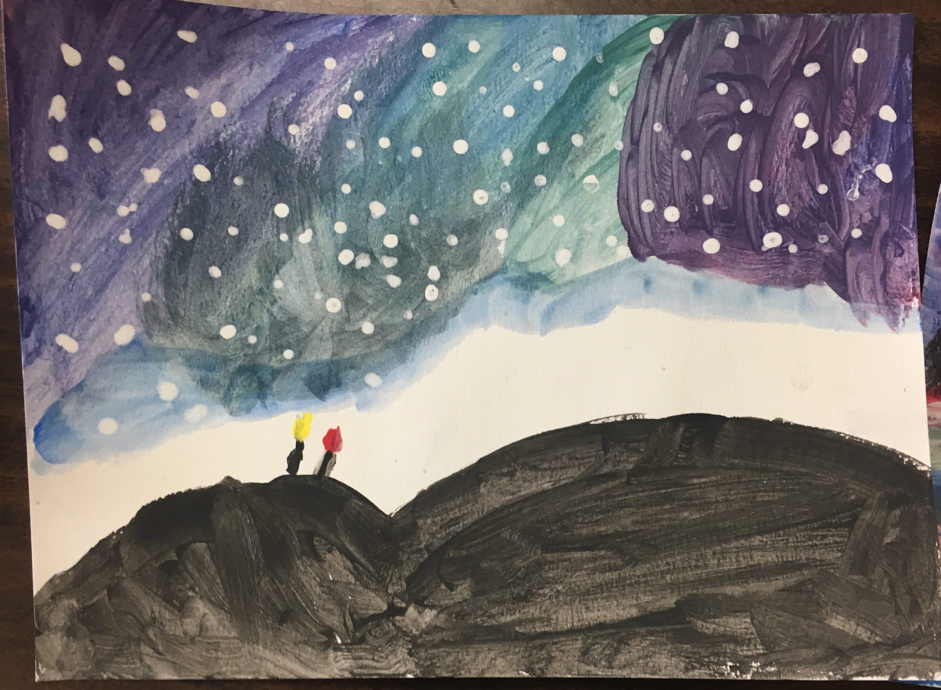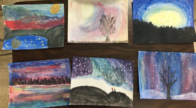 This lesson went really well. Students were engaged the whole way through and they produced art that they were really happy with. The time to share at the end was great and the students were really engaged with each others paintings. There was a really nice and very unexpected moment. Since the beginning of the semester we have been challenged to “keep a kid in our pocket”. The “kid in our pocket” is a student that we’ve been challenged to keep in the back of our mind– they might need a little extra help or be someone that you can support during your time in the classroom, or just someone to get to know a little better about who they are as a student. When we shared our artwork with the class, out of nowhere, the “kid in my pocket” got a round of applause for his artwork from his peers. WOW! Who could have predicted that! The power of art for making all students feel successful. Great way to end a lesson. Also later in the hall I heard one of my students sharing the myth from my set with a student from the other 6/7 class. A very successful day overall.