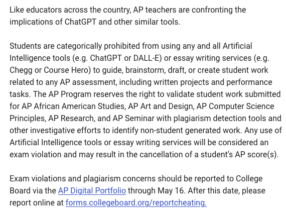 So we are now running into the issue that not only can AI produce passable exam responses but it is learning and developing at an exponential rate. Add to that the fact that it is very difficult to catch with any sort of true reliability. If we move beyond simply essay writing and taking tests that have a “correct answer” to things like creative thinking and art you would think there would be no way that AI could hold up to humans. However as you can see education is already trying to develop policies to deal with AIgiarism in art. For example here is what is listed about ChatGPT and other AI on the College Board website for AP art exams: